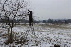 | Michal Pašek při řezu jabloní v Dalovicích. |